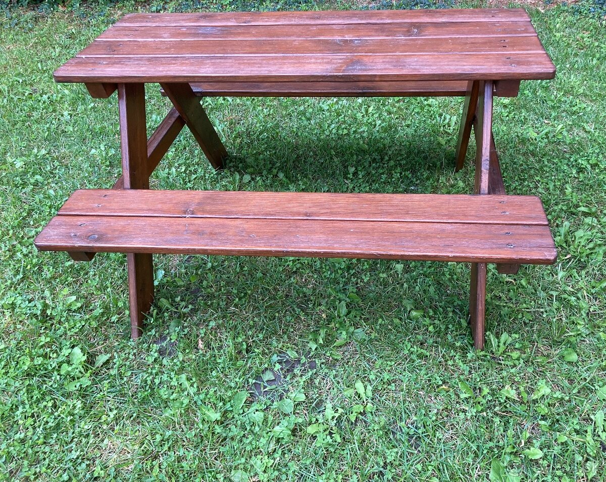 Záhradný detský stolík - drevený, používaný (pod strechou) natretý farbou na detský nábytok. S lavičkami.