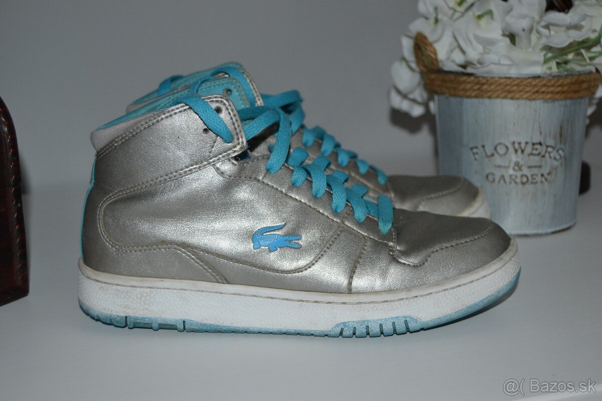 Dievčenské kožené strieborné kotníkové tenisky Lacoste, veľkosť 36.