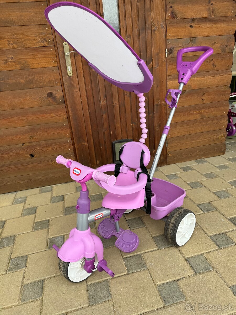 Predám detskú trojkolku Little Tikes. Trojkolka 4v1, pre bábätká a najmenších vodičov! Tento atraktívny trojkolkový model rastie spolu s dieťaťom. Predávam so všetkým príslušenstvom vrátane tienidla. Má pevnú konštrukciu z kovu a plastov. Na tyči je pohodlný držiak na nápoj.