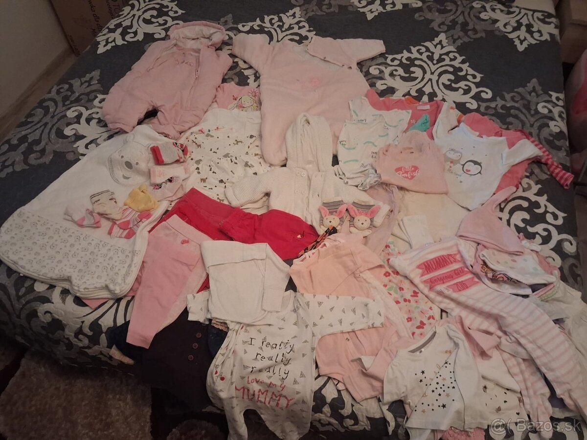 Predam sadu novorodeneckého oblečenia (bodička, čiapky, leginky, ponožky, overaly, dupačky, vaky) vhodné pre dievčatko od narodenia po cca 6mesiacov.