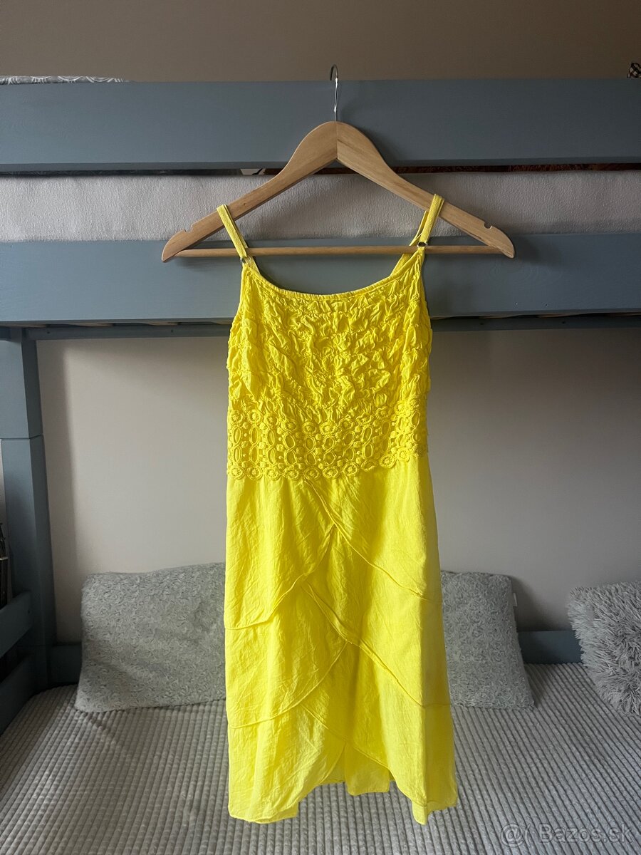 Krásne slniečkovo žlté šaty na ramienka. Horná časť je zdobená bohatou výšivkou a čipkou, sukňa má zaujímavé prekladanie. Farba je veľmi sýta a krásne zvýrazní opálenie.