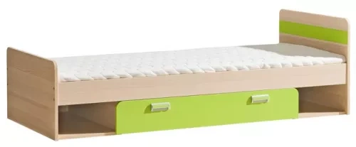 Predám detskú posteľ s úložným priestorom zo systému LORENTO. Zásuvka postele je na kolieskach. Nábytok je opáskovaný kontrastnou farebnou PVC - ABS páskou. Farebné prevedenie: jaseň calabria/zelená. Posteľ s roštom a matracom.