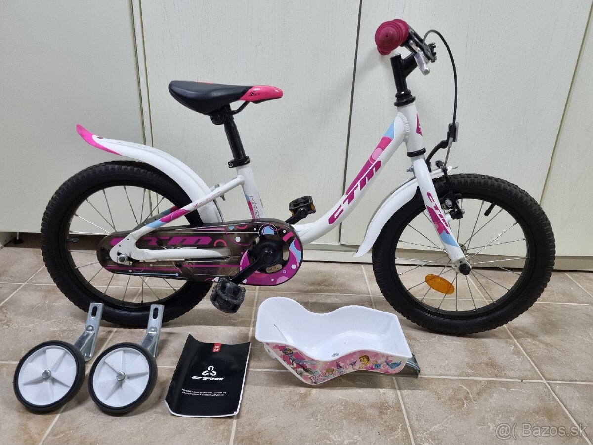 Predam kvalitny bicykel,znacky CTM Marry, 16 palcovy (pre cca 4-6rocne). Kupovany ako novy,pouzivany len 1 dietatom. Je vo velmi dobrom stave. Ma pomocne kolieska a sedacku pre babiku+dokupeny stojan na bicykel