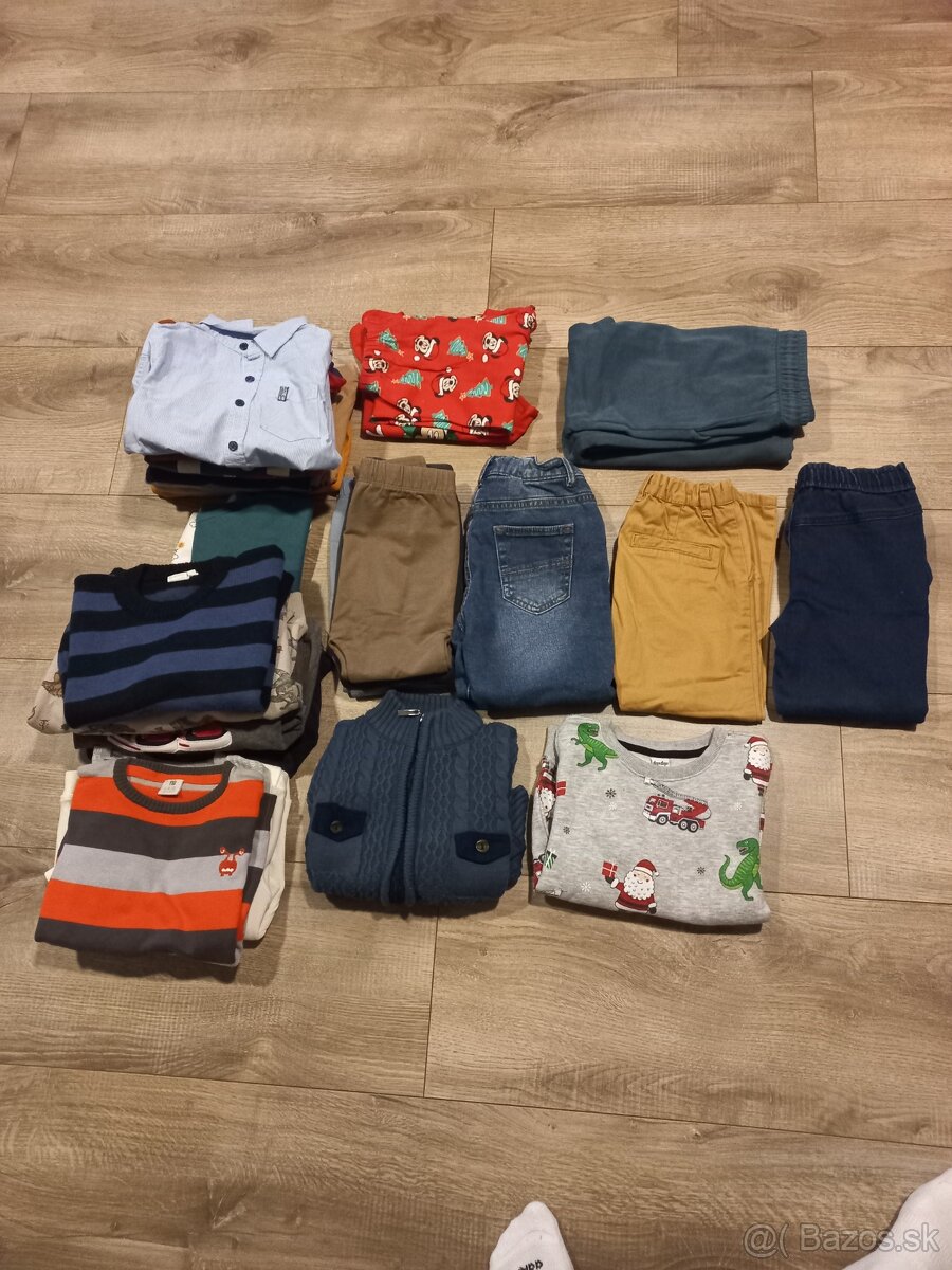 Predám balík pekného oblečenia veľkosť 110.Balík obsahuje:teplákovú súpravu,vianočné pyžamo,2tielka,7tričiek,košelu,6svetríkov,2mikiny bez kapucne,mikinu s kapucňou,sako,nohavice,rifle,termo rifle,3legínsy.Cena 30e+poštovné
