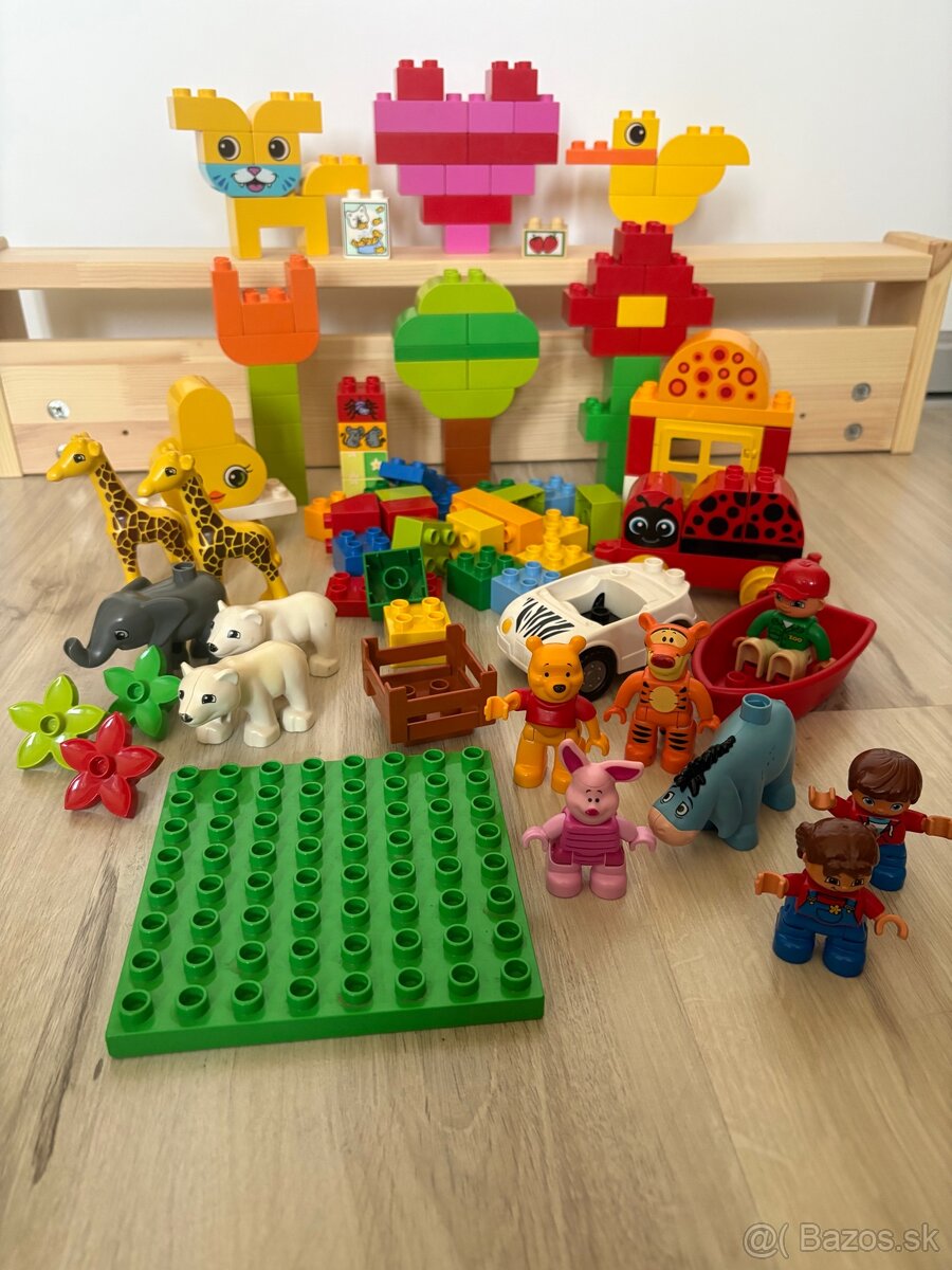 Lego duplo mix - stavebné kocky, zvieratká, Disney Macko Puf / Medvedík Pú s kamarátmi - prasiatko, oslík a tiger (Winnie the Pooh), čln, auto zoo, figúrky, podložka. Pekný hraný stav.