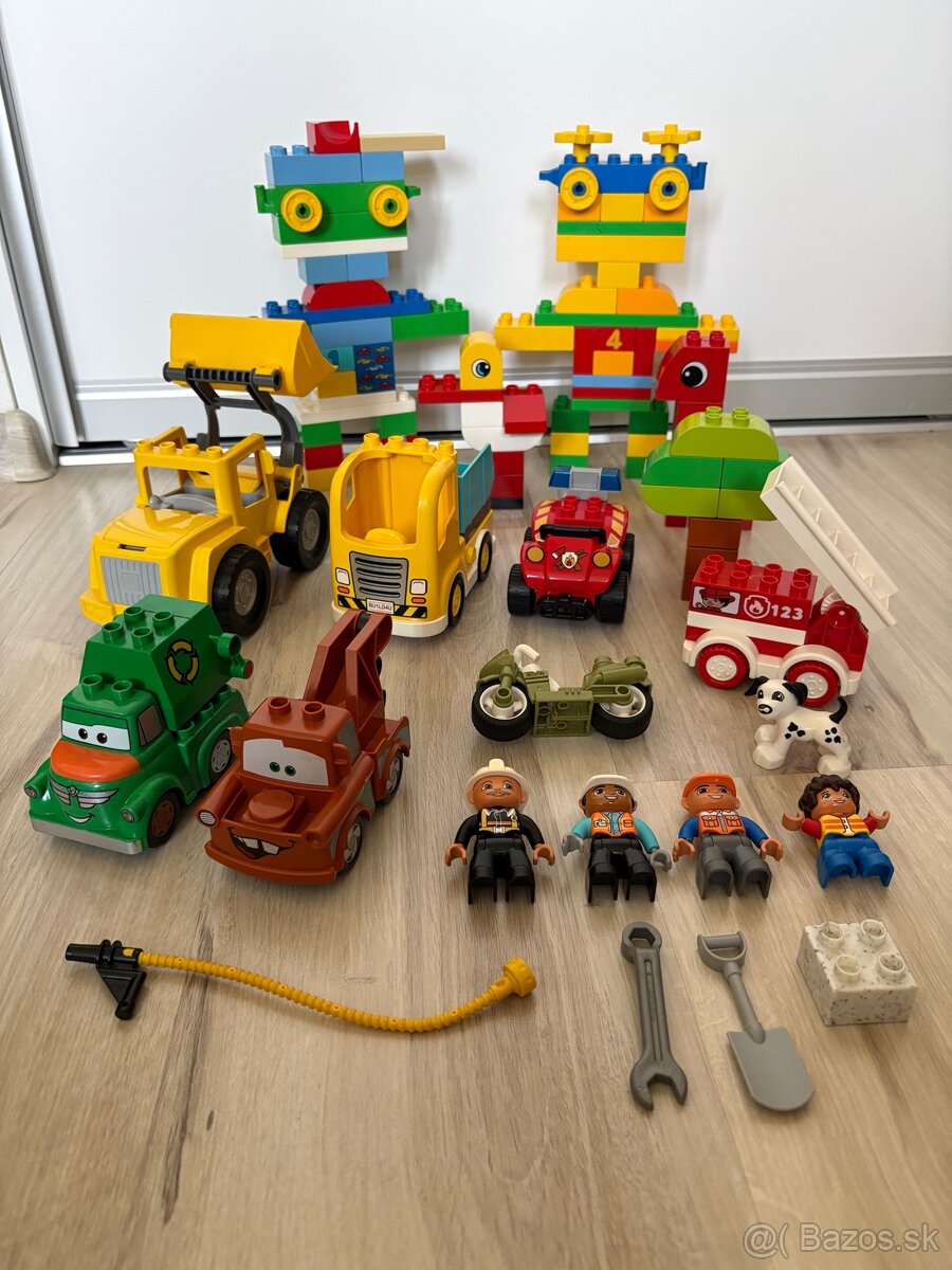 Mix lego duplo kociek, hasiči, stavebné autá, motorka, disney cars, figúrky a iné komponenty.