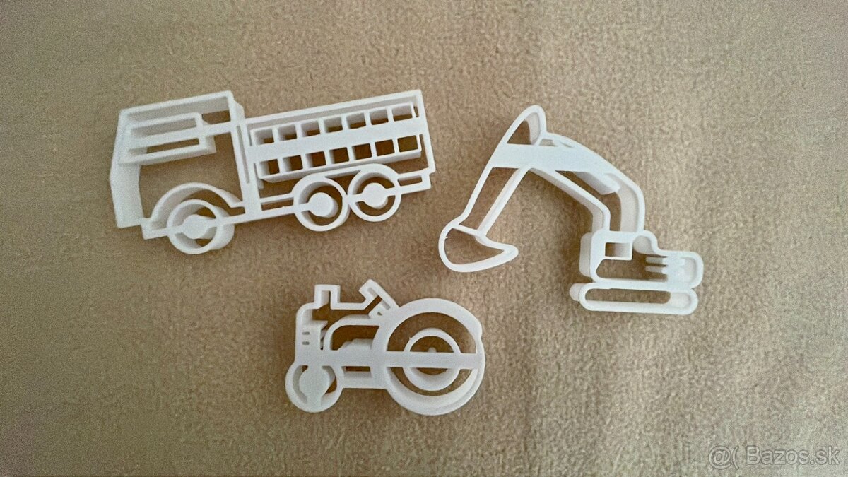 Ponúkam na predaj vykrajovačky vytlačené na 3D tlačiarni. Sú vyrobené z nezávadného plastu PLA. Balenie 3 kusov – nákladné auto (tatra), bager a traktor.