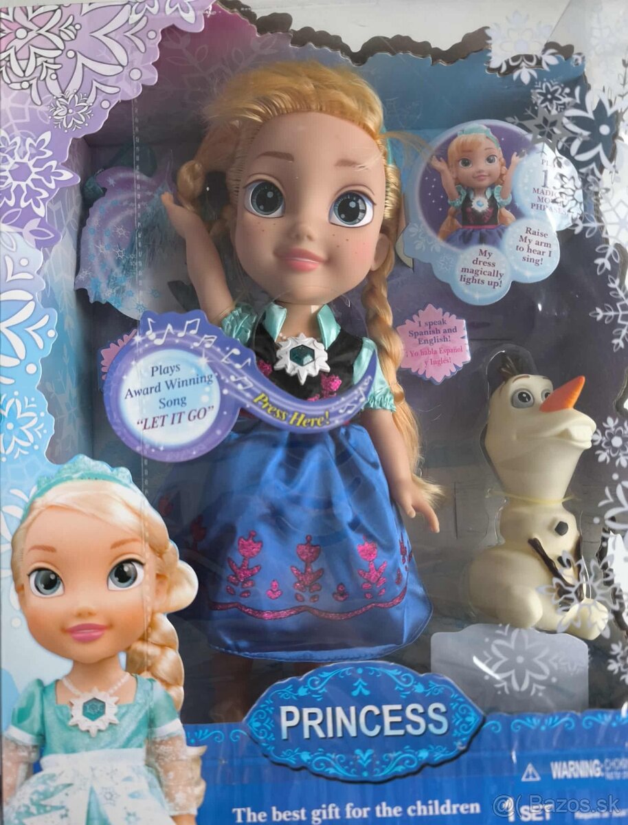 Po stlačení magického náhrdelníka so snehovými vločkami, budete počuť 15 rôznych fráz a pesničiek a šaty princeznej sa celá magicky rozžiaria. Zdvihnite princeznej ruku, aby ste počuli pieseň ,, Let It Go". Výška bábiky je 40cm.