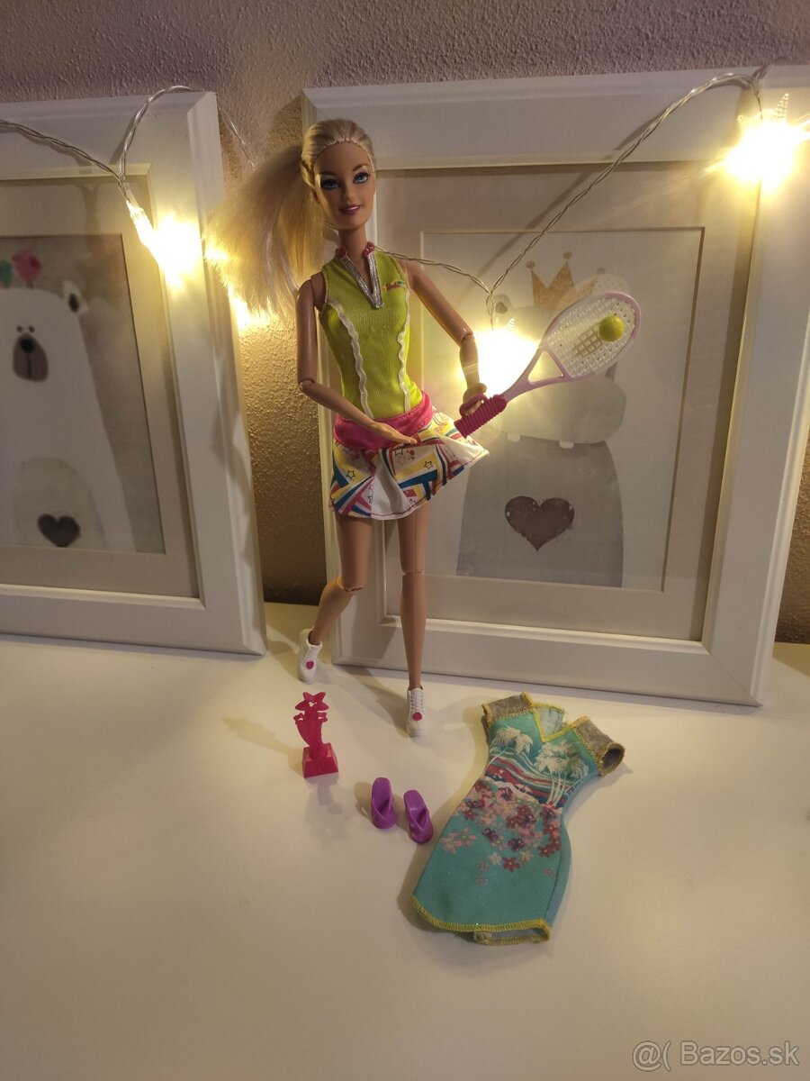 Barbie ICan be Team Barbie Olimpic Tennis Doll klbova ohybna. Barbie je máličko hrana, hranie vidno na končekoch vlasov a na šatach na hrudniku. Je kompletná, nič nechýba. Pridávam ešte voľnočasový outfit ;) Cena za všetko na foto: 10€.