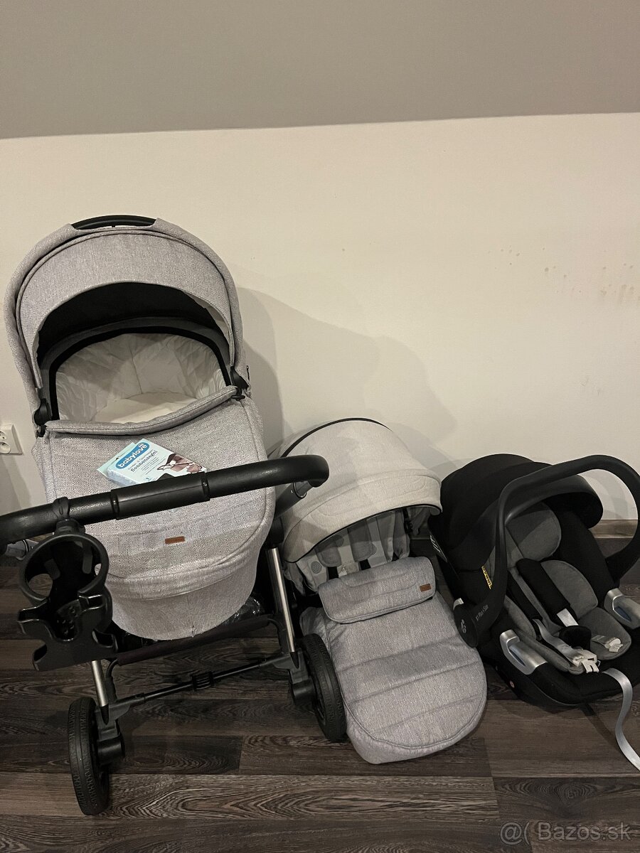 Hlboká vanička, športová časť, vajíčko, isofix základňa, adaptéry na vajíčko, moskytiera, pláštenka, držiak na fľašu zn. ZOPA, podložka do športovej časti zn PINKIE