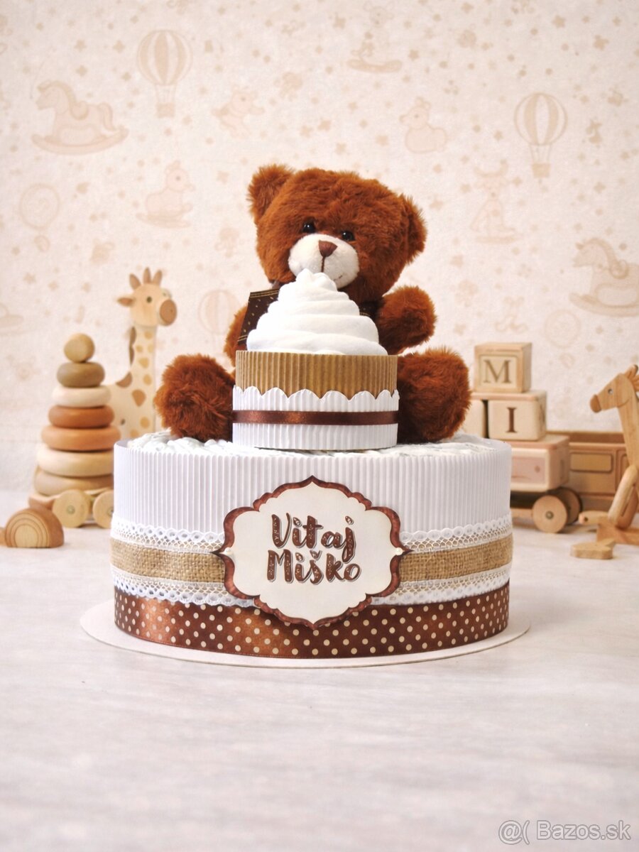 Plienková torta BÉŽOVÝ KOLOTOČ - [16.3. 2026]Plienková torta obsahuje 30 ks jednorazových plienok Pampers Premium, veľ.2 (4-8 kg), 3 páry ponožiek, 1 slintáčik