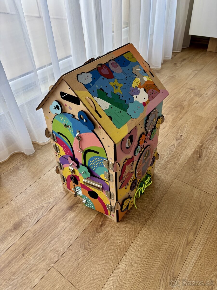 Activity board domček pre princezné s dievčenskou rozprávkovou tématikou (aktuálne vypredaný na eshope Elis design). Každá strana activity boardu je originálna, v krásnych farbách, s množstvom hracích a montessori prvkov a ponúka nespočetne veľa možností k hre. Na streche deti nájdu vkladacie puzzle, zrkadlo a vypínač, pomocou ktorého vykúzlia príjemné svetlo vo vnútri domčeka. Acitivity board domček s LED osvetlením predstavuje také množstvo hračiek v jednom, že ich len ťažko spočítate.
