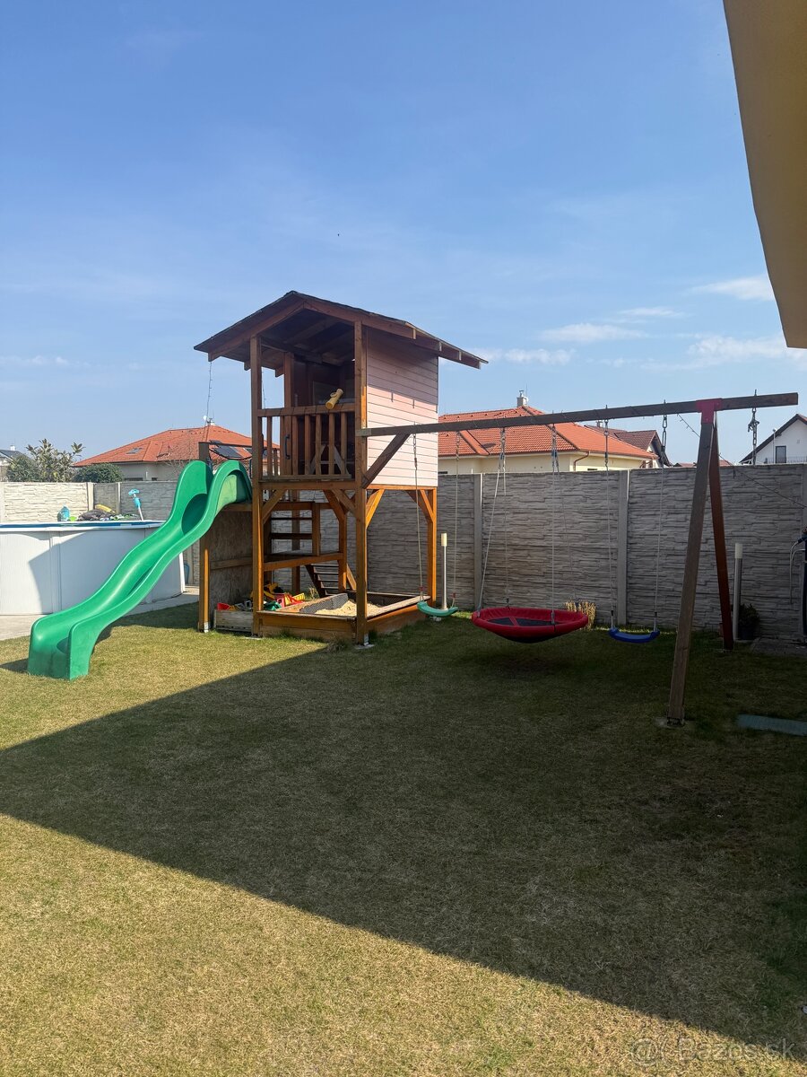 Dobrý deň, posunieme naše parádne veľké ihrisko zo smerového dreva so šindlovou strechou. Kopec príslušenstva - 3m šmykľavka, pieskovisko, dve hojdačky, kruh na hojdanie, lezecká stena, ďalekohľad.Vo vnútri domčeka tabuľa na kriedu.