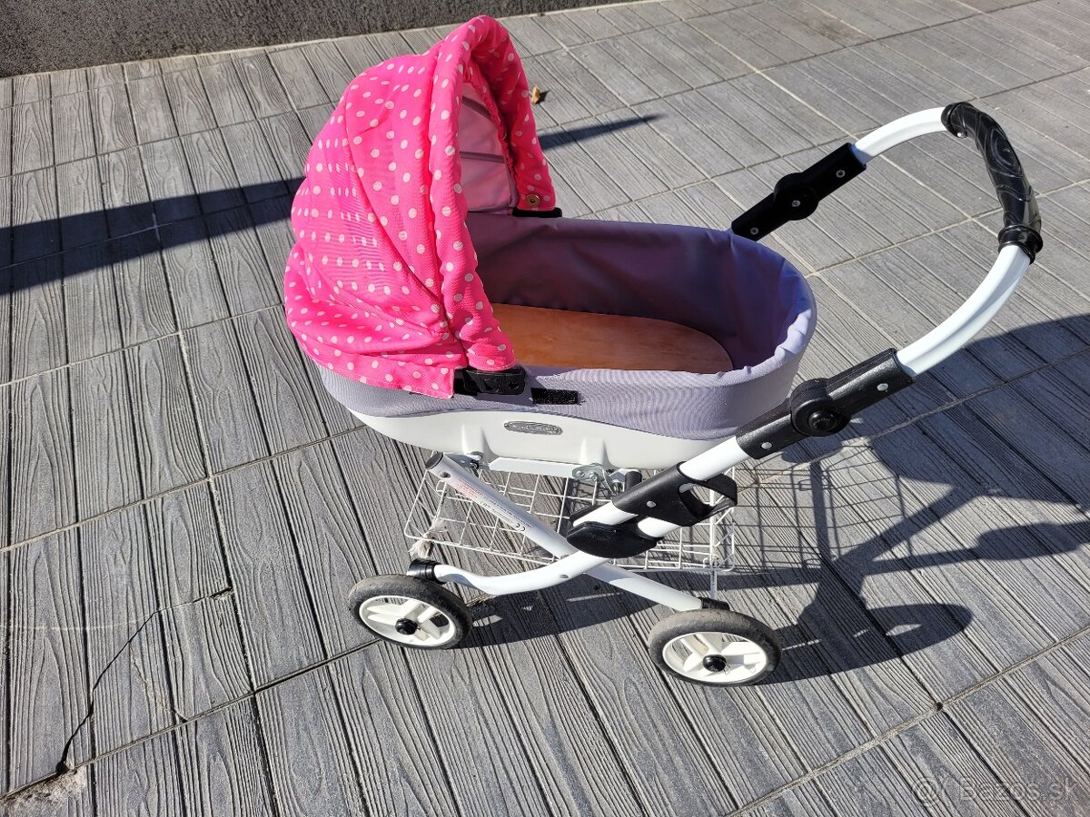 Predám kočík pe bábiky ako na obrázku, skladací rám, odnímateľná vanička, výškovo nastaviteľná rukoväť, sklápacia strieška, košík. Chýba kryt na vaničku, taška a matrac.