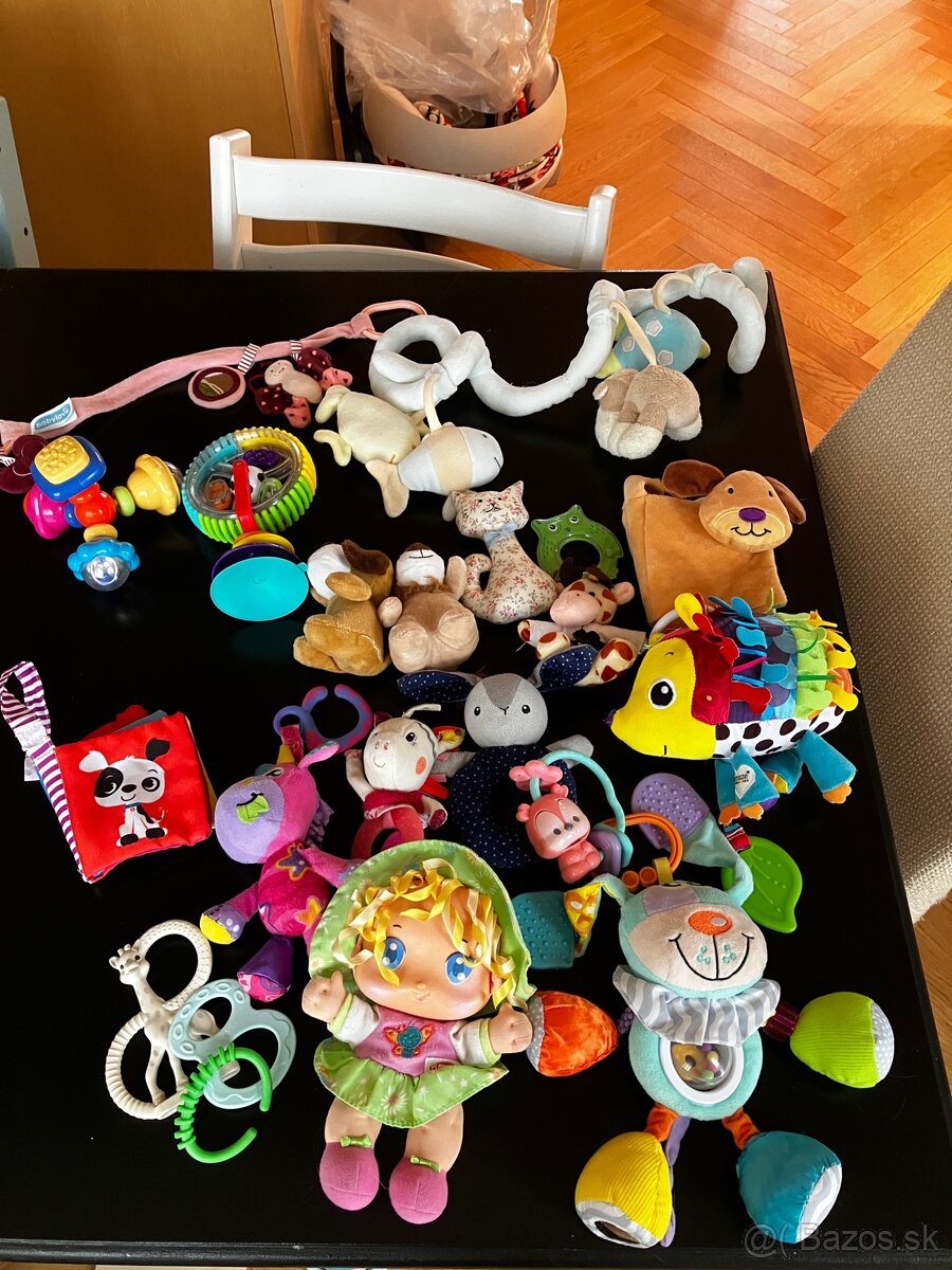 Veľký balík prvých hračiek pre bábätko - hrkálky, hryzátka, knižky, plyšové zvieratká.
