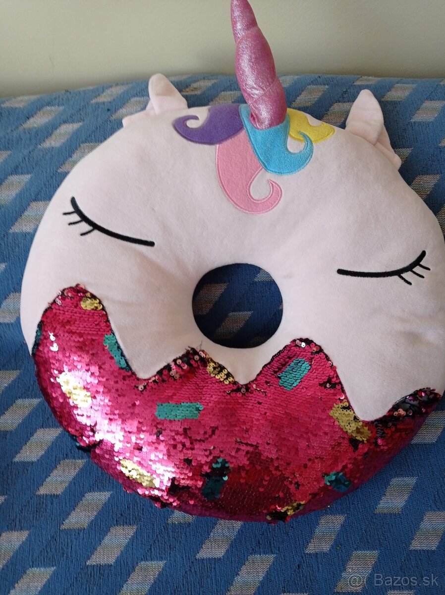 Velmi pekny vankus jednorozec, farebne odlisnosti su odfotene v detailoch, ako aj dierka vo flitrovanej casti, staci zasit