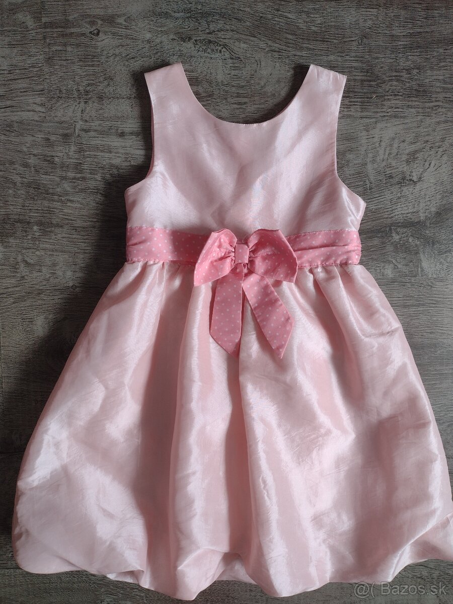 Slávnostné šaty s mašľou H&M - NOVÉ - veľkosť 98 - [16.3. 2026]Nenosené, s visačkou. Suknička je bohato riasená, s kontrastnou mašľou ozdobenou kvetmi. Vzadu na gombíky.