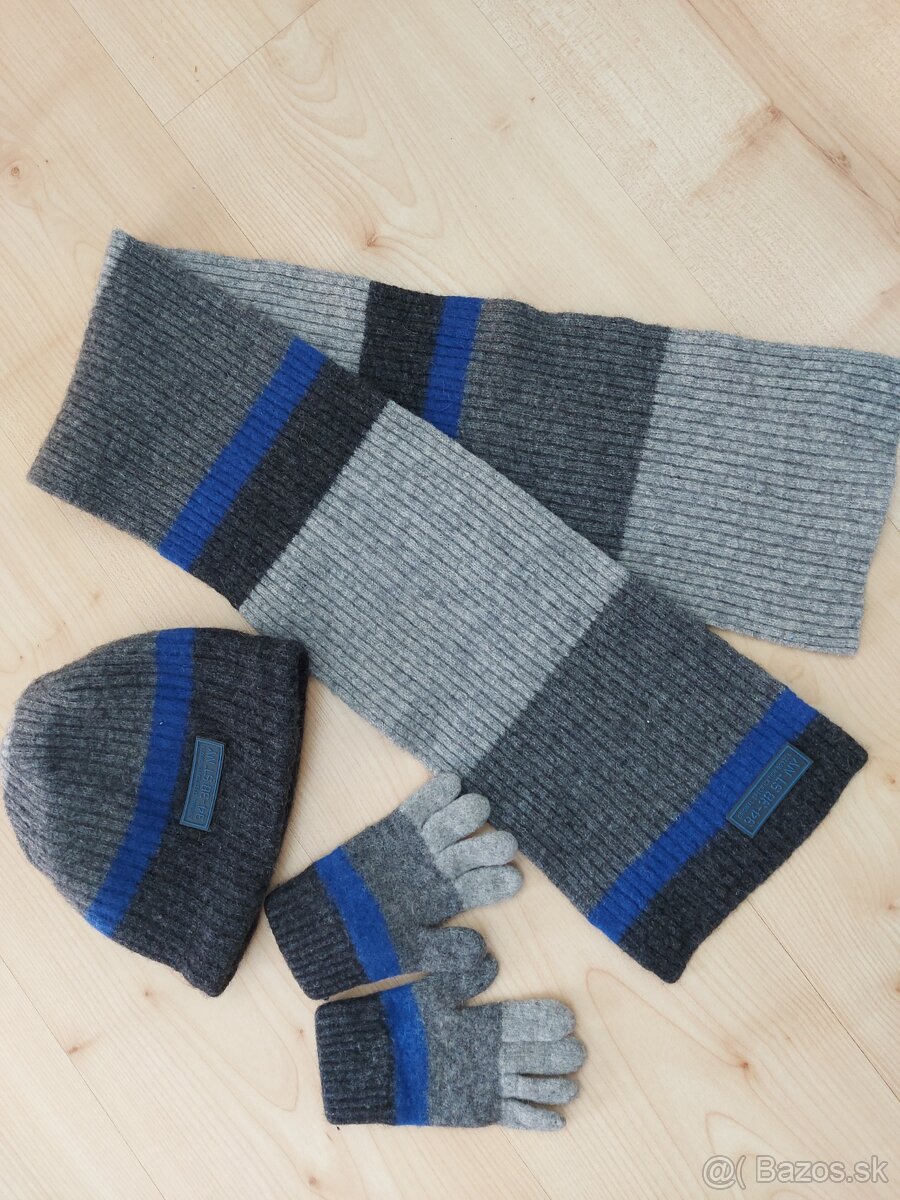súprava čiapky so šálom a rukavicami, uvedená veľkosť 3-6 rokov, čiapka určite menšia, odhadujem na 2-3 roky, podšitá bavlnou, pár krát oblečené, bezchybný stav, kombinácia svetlošedej, tmavošedej a modrej
