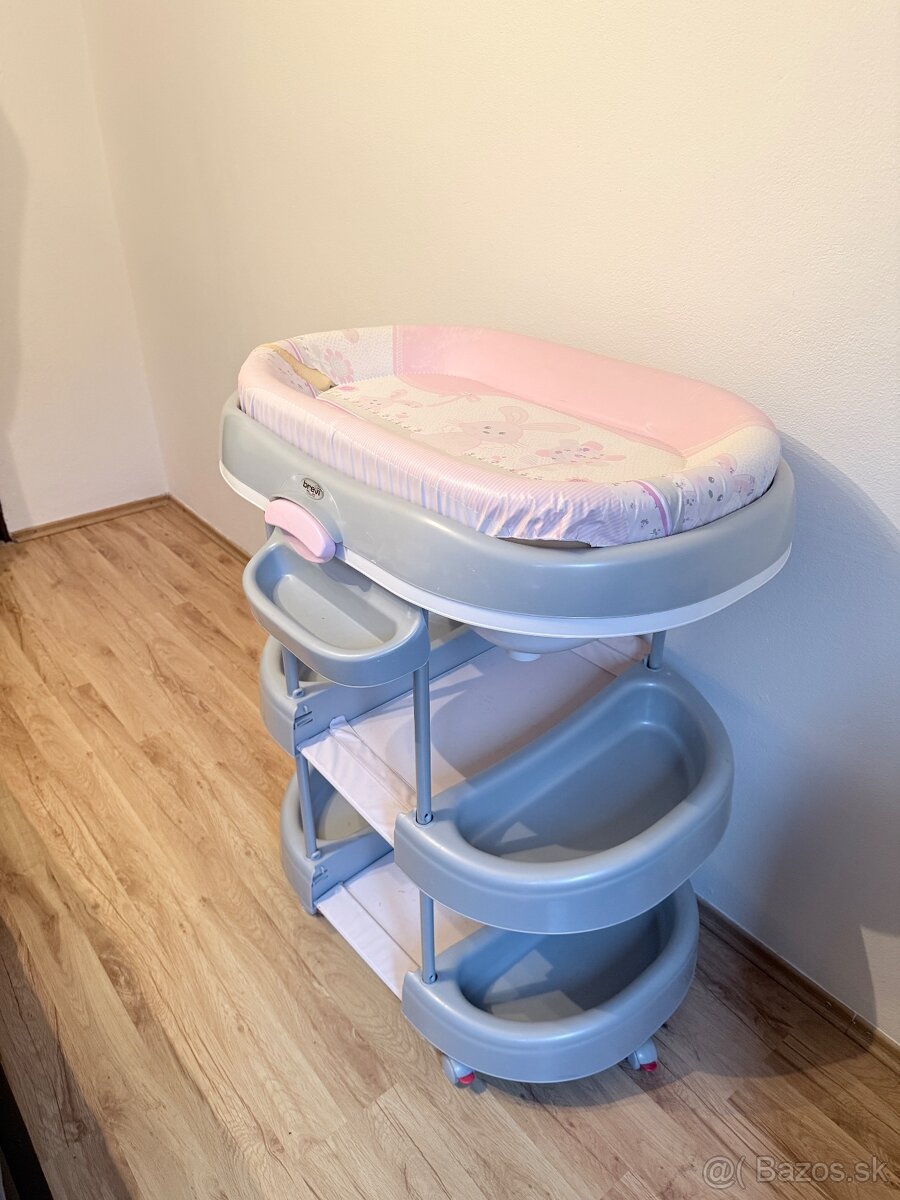Predám kvalitný prebaľovací pult značky Brevi. K pultu je aj vanička na kúpanie novordenca. Pult je stabilný, kvalitný a prenosný, má 4 kolieska s brzdami, využívali sme ho pri dvoch deťoch. Na poťahu sú dve diery.