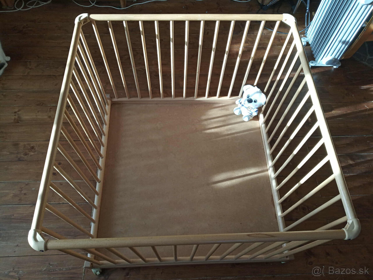 Drevená ohrádka. Používaná ale funkčná. Podlaha je sololit, pôvodne tam bol ešte molitan. Dá sa dať do viacerých polôh. Možnosť vybrať tyčky a urobiť vchod. Rozmer cca 1x1m. Preferujem osobný odber. Sms alebo mail.