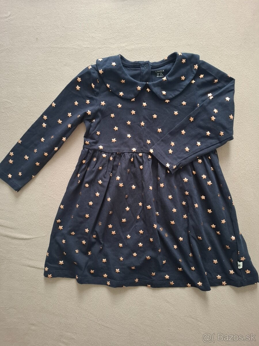 Predám Lindex šaty vo veľkosti 98. V peknom stave. Farba je tmavomodrá so zlatými hviezdičkami. Maju jeden fliacik, ako keby od fixky.