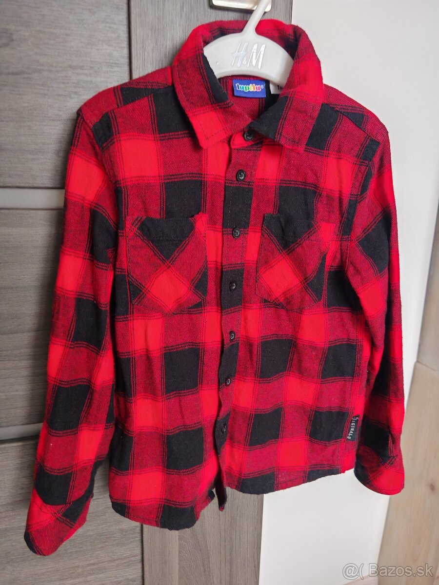 V ponuke rôzne chlapčenské košele. Červená aj ako vianočná a žltá veľkosť 110 cena 4€, modrá 116 cena 4€, modro-žlta 122 cena 3€ a modro-cervena 104 cena 3€.