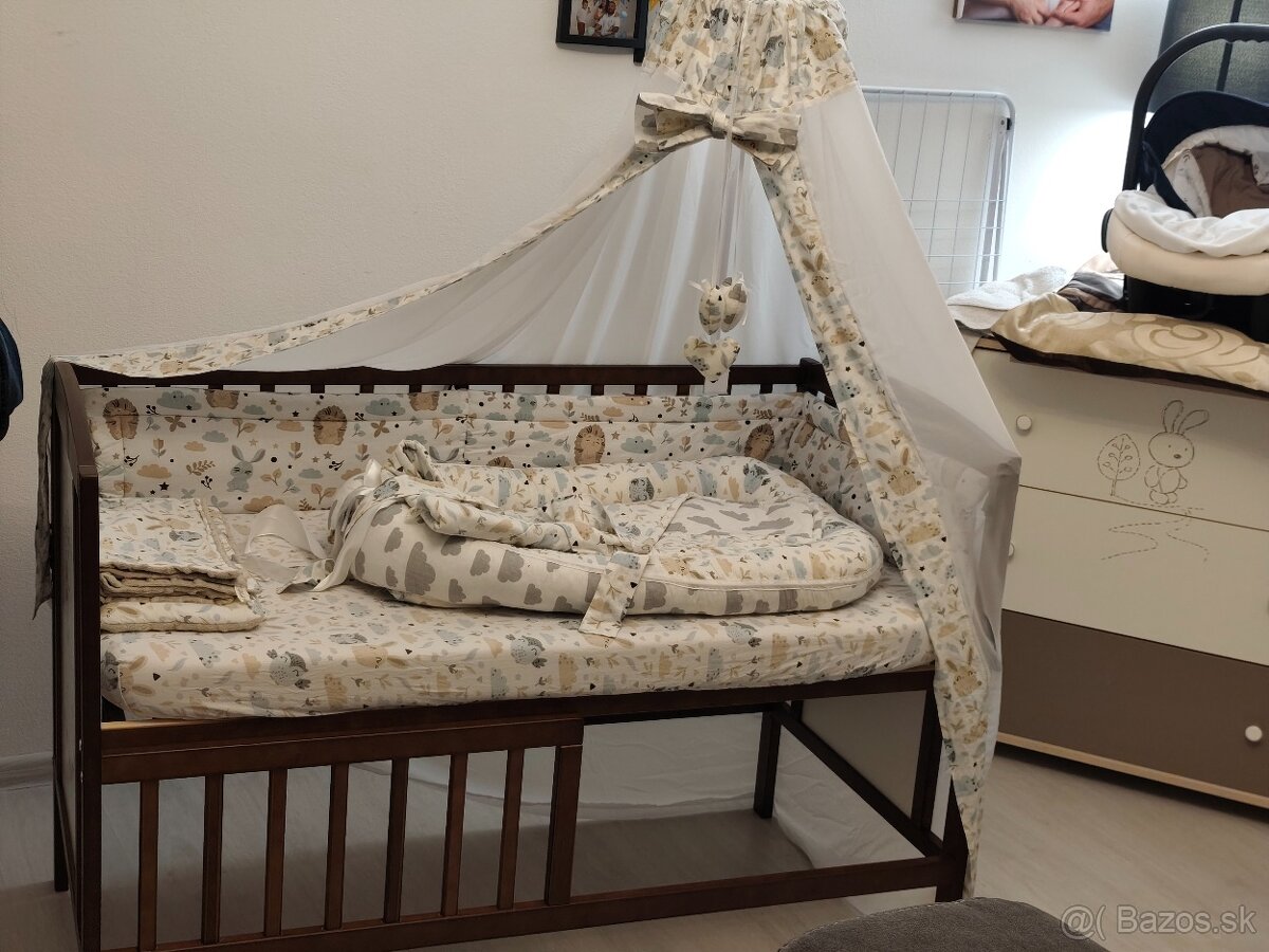 Predám na mieru šitý set do postieľky.Ako darček pribalim aj stojan na baldachin + 1 kupovaný mantinel. Osobný odber KN.