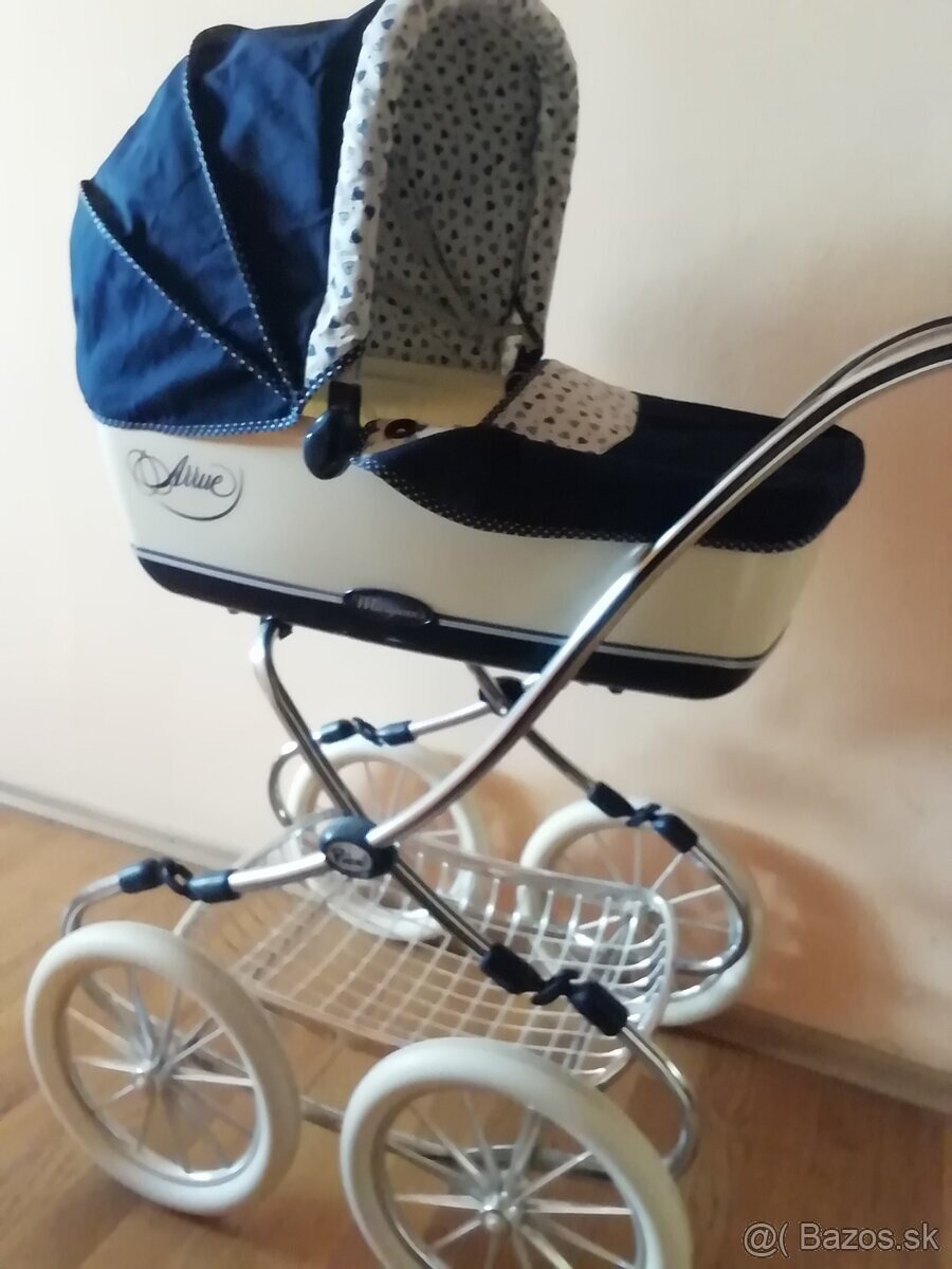 Predám kočiar nehraný,zo súkromnej zbierky,bielo modrý, výška madla je 84 cm, je hojdací, vyska po striešku je 102 cm. Len osobný odber Velka babika 65cm, 60 eur, psik od Barbie,ktory papa a kaka granulky 8 eur