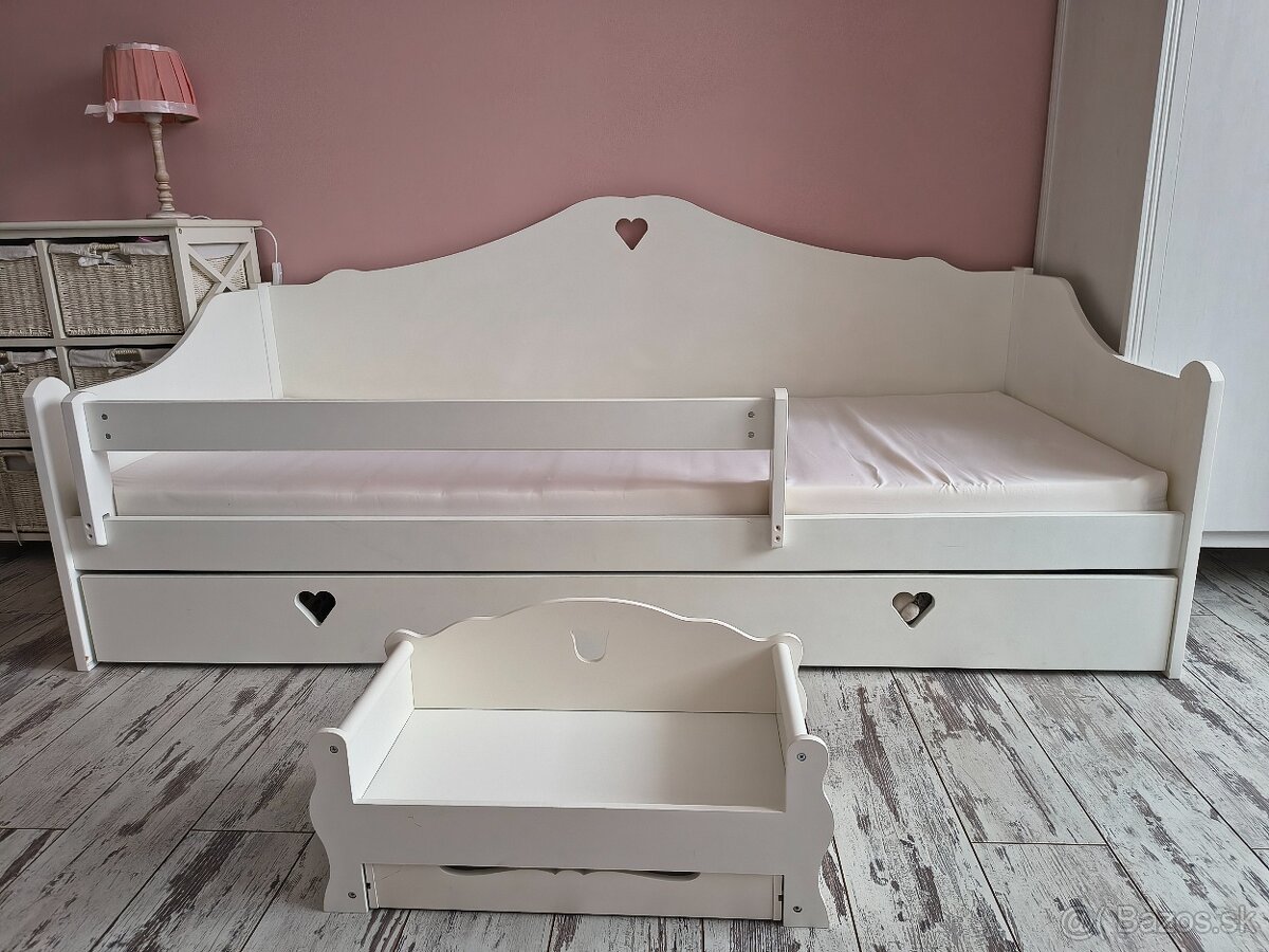 Predám detskú posteľ pre malú aj veľkú princeznú. 🙂 Posteľ je bez poškodení, súčasťou je odnímateľné madlo, rošt, matrac v rozmeroch 80x180, úložný priestor, či už na periny, plyšákov, alebo čokoľvek iné a postieľka pre bábiku v rovnakom dizajne. V prípade záujmu darujeme aj poličku a vešiačik, ktoré sú na stene.