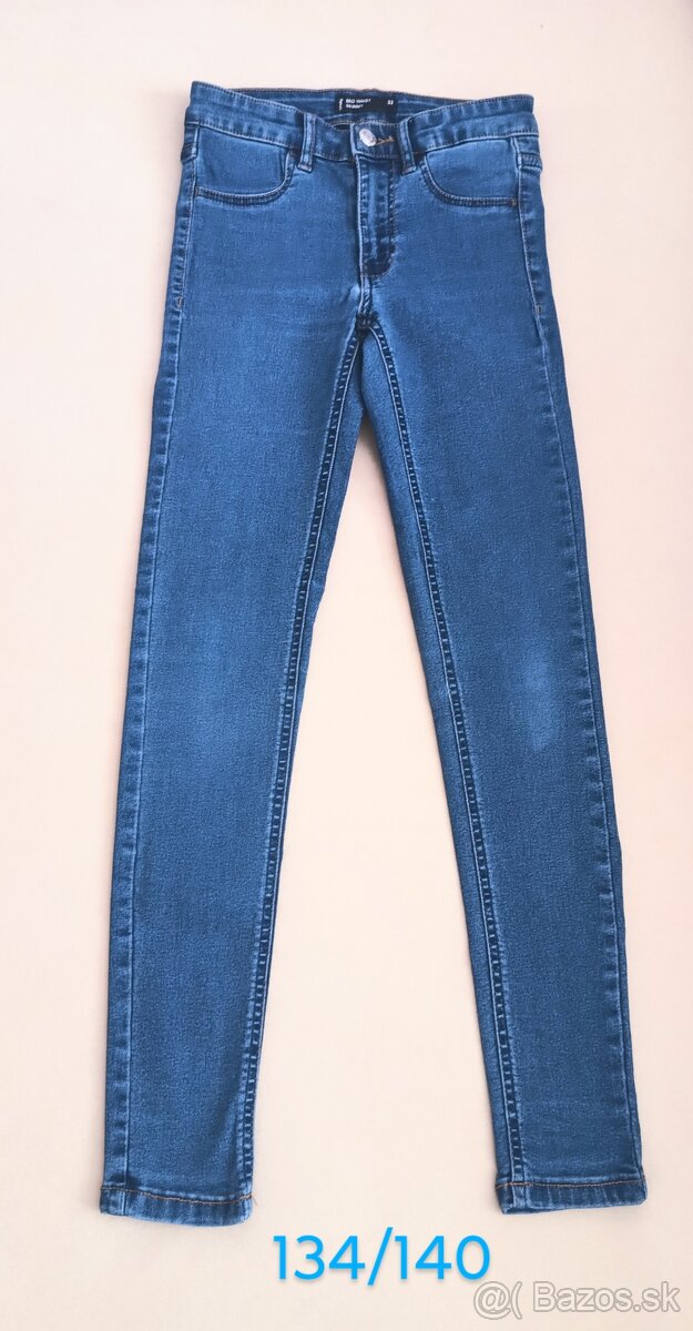 Predám dievčenské rifle. Sú vo veľkosti 134/140, tak od 8 do 10 rokov. Dole zúžené, ako legíny. Mäkká rifľovina. Strečové. Pár krát nosené, bez poškodenia, ako nové. Kupované v Sinsay. Cena je 3 Eur. K tomu pribalím tričko v rovnakej veľkosti.