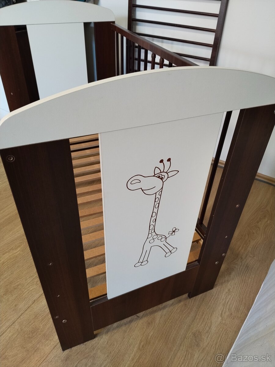 Detská postieľka s matracom a roštom, veľkosť 120x60cm, 3 polohy roštu, bočná strana sa dá zložiť (chýbajú 2 sroby). Priložím 2 plachty. Osobný odber BA NM
