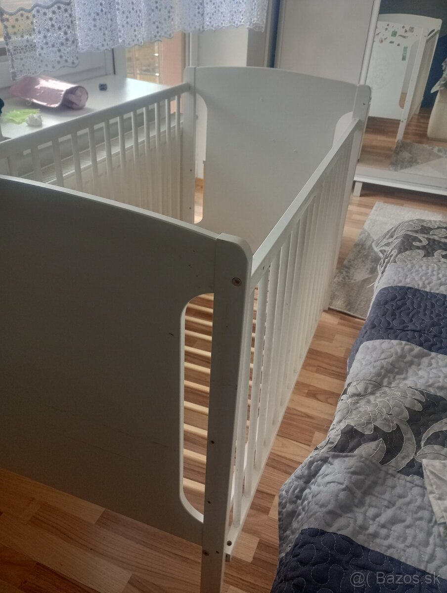 Predám zachovalu detskú postieľku bielej farby s matracov, rozmery 60x120, rošt nastaviteľný do troch polôh,odoberatelne zábradlie kvôli vychadzaniu