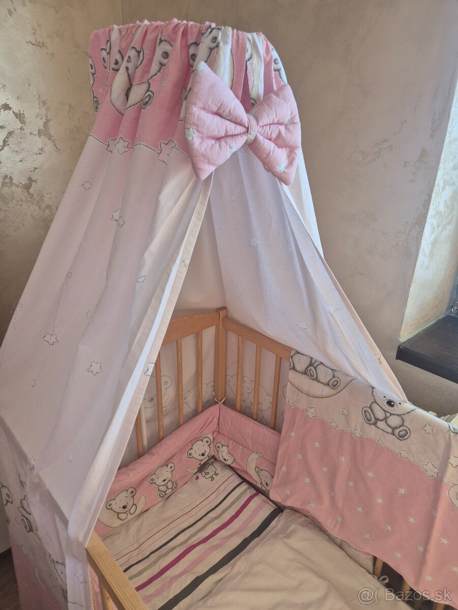 Predám detskú postieľku bola kupovaná nová je teraz po jednom dieťati,postieľka je v poriadku,predávam ako celok,má 3 polohy,2 tyčky sú vyberateľné,je k nej stojan na baldachyn,baldachyn,2xmatrac,nepremokavá plachta,plachty,poduška a paplón,mantinel okolo postieľky,návliečky nájde sa na jednych sem tam fliačik ale inak bez poškodení,cena 50€ (osobný odber)popripade okolie TN doveziem