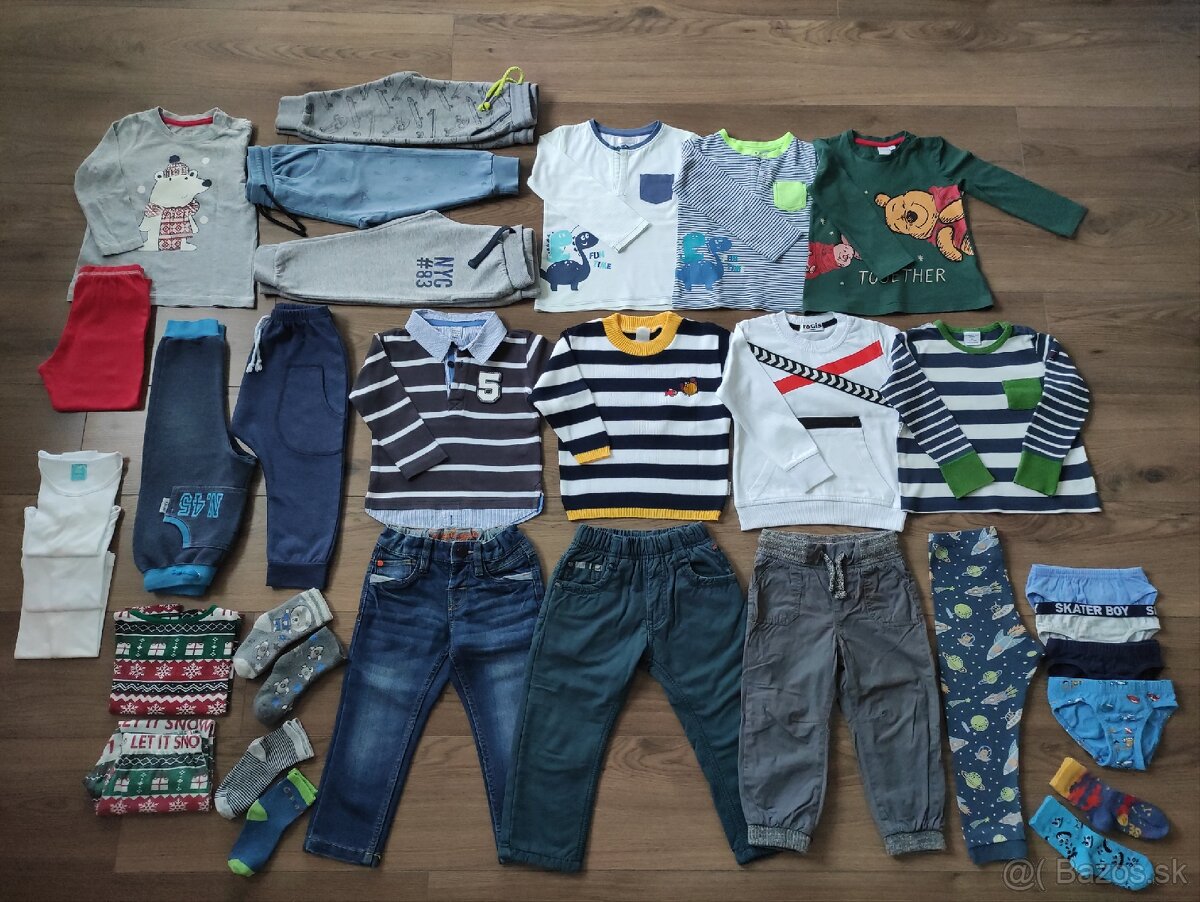 OBSAH BALÍKA: 3x tepláky, 2x pudláče, legíny, rifle, podšité sivé nohavice, hrubšie zelené nohavice podšité fleecom, 2x pyžamo, 3x tielko, 4x slipy, 4x ponožky, 2x hrubé ponožky, 1x svetrík, 6x tričko dlhý rukáv