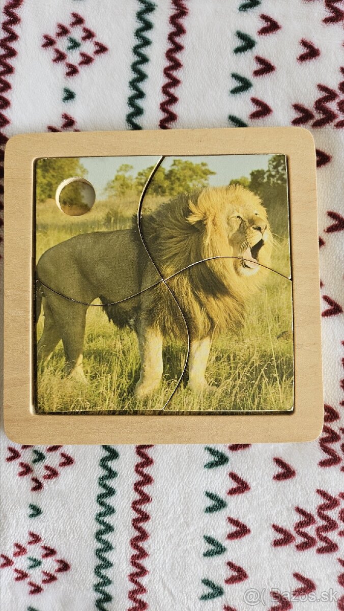 Drevené puzzle pre najmenšie deti skladajú obrázok leva. Dieťa rozvíja mozgové funkcie. Používa sa aj pri montessori.