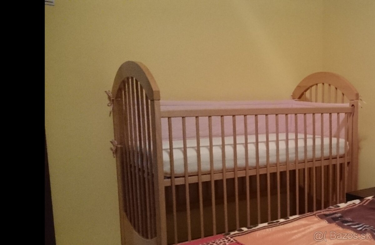 - Drevedna postielka, ma dve urovne polohy madraca, predna strana posuvna, matrac, 2× mantinel, perinka, vankus, plachta ( jedna je nepremokava), uterak, mojkac. Momentalne je rozobrata. Bola malo pouzivana.