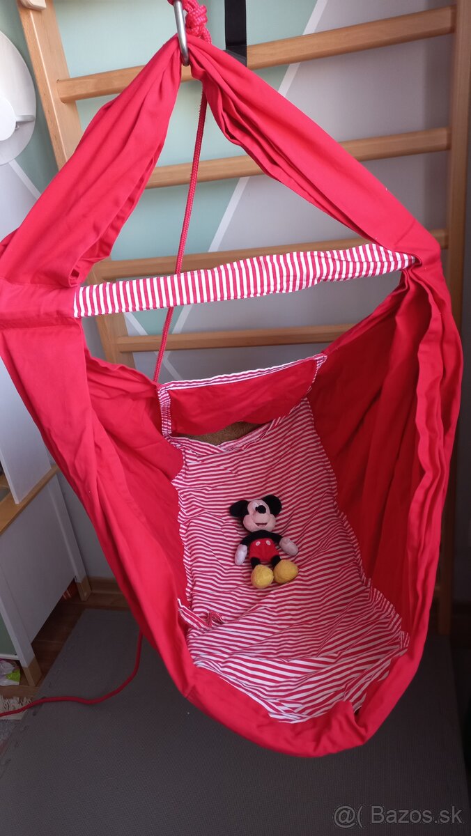 Detska hojdacka (hacka) ceskej znacky Tiki Mechulka. Cervena/pasikava. 100% bavlna, rozperna tyc z dreva. Vratane pruziny (tvrdsia) a matraca z kokosoveho vlakna. Vhodna od babatka cca do 2 rokov. Cervene lanko na "handsfree" hojdanie :) ,cierne lanko istiace na pruzinu. Vratane hornej karabiny (na fotke chyba). Farba miestami vyblednuta od slnka. Vyprata, vyzehlena. Osobne BA alebo plus postovne