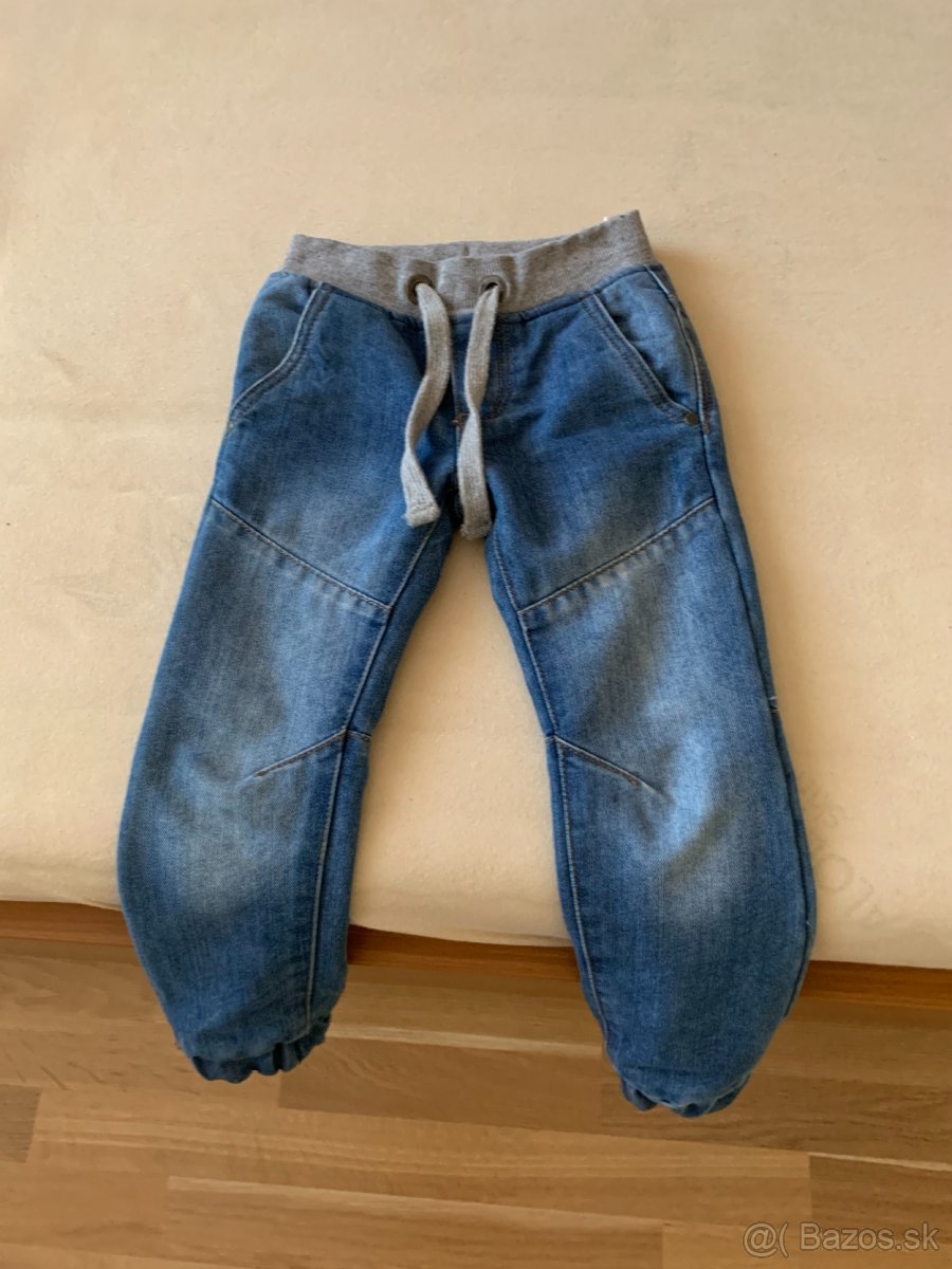 Predám chlapčenské zateplené rifle modrej farby. Viazanie v páse na šnúrku. Veľkosť je 104, vhodné pre 3-4 roky.