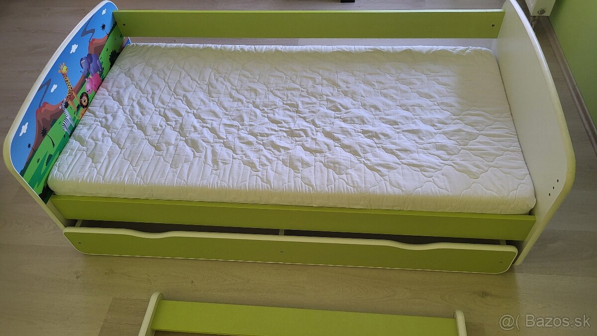 Destká postieľka zn. Babynabytek. Krásna, vo výbornom stave. Jediná vada je nalomená jedna lišta z roštu, ktorú by bolo dobré vymeniť. Cena je vrátane roštu a matracu, zásuvky na kolieskach a zábrany. Je to antialergický matrac s kokosovým vláknom. Posteľ je dlhá 160 cm, šírka bočného panelu je 90 cm, matrac má 80 cm. Nutný osobný odber v BA - Karlova Ves.