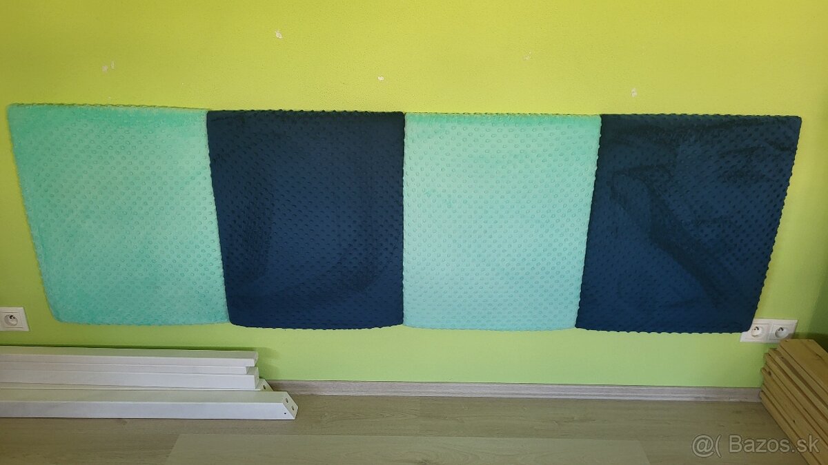 Čalúnený panel na stenu, kombinácia farieb Mint a Tmavomodrá. Značka Benlemi. Upevňuje sa koľajničkami -lištami na stenu. Jedna lišta sa navŕta na stenu, lišta na panely sa do nej zasunie, čo umožňuje umiestiť ich v ľubovoľnej výške k posteli. Materiál sa označuje ako Minky bavlna. Vo výbornom stave. Cena je za 4 panely ako na obrázku, aj s lištami. Jeden panel má šírku 50cm, výšku cca 62 cm. Obrázok s posteľou ber ako ilustračné foto;) Domčeková posteľ je na predaj tiež, v samostatnom inzeráte. Osobný odber v BA-Karlova Ves.