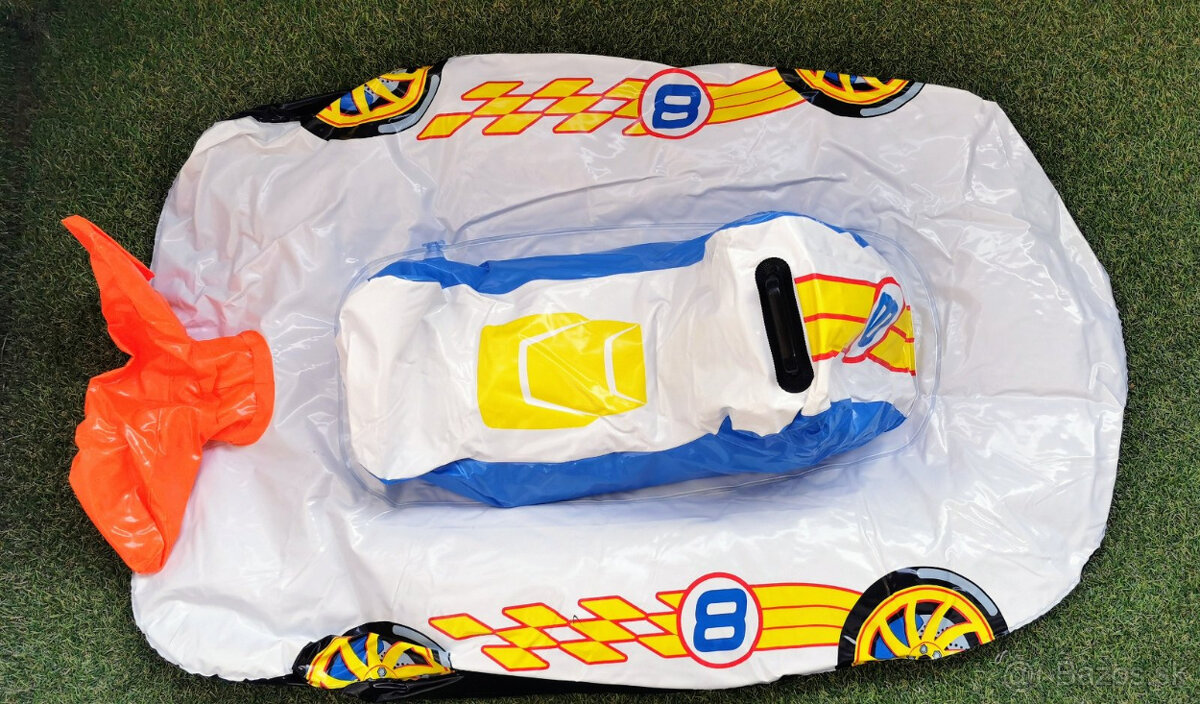1x použitá nafukovačka v podobe pretekárskeho autíčka, má nafukovacie dno, udrží sa na hladine aj s dieťaťom. Poistné ventily, odolný vinylový materiál, rozmery: 110 x 75 cm
