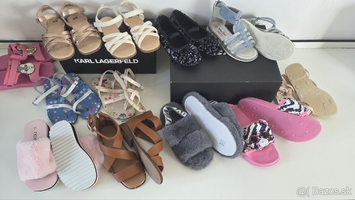 Predám 12 párov letných dievčenských topánok = sandále a šľapky. Väčšina nové, nepoužité. Čísla od 29 do 31 veľkosť