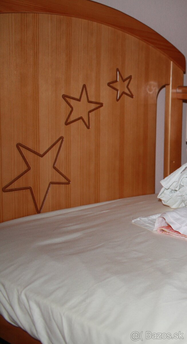 Predám detskú drevenú postieľku bez matraca, farba čerešňa s motívom hviezdička.