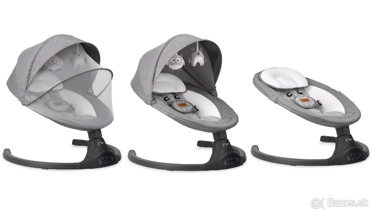 Ležadlo MoMi KENANI kombinuje všetky výhody podobných pomocníkov, a navyše ponúka širokú škálu funkcií, ktoré vás aj vášho drobčeka veľmi potešia. Je vybavené desiatimi melódiami, ale aj Bluetooth jednotkou. Hojdanie sa dá nastaviť v piatich stupňoch na dobu až 30 minút, keď na napájanie môžete použiť ako sieťový zdroj, tak aj batérie. Na zábavu bábätku poslúžia dve roztomilé hračky, ktoré zavesíte pomocou suchého zipsu, a komfortné ležanie zaručí použitie extra jemných a mäkkých textílií. Neoceniteľnými doplnkami sú strieška s moskytiérou a diaľkové ovládanie. Príjemným bonusom je extra skladnosť a jednoduché používanie tohto ležadla. Elektrická hojdačka pre najmenších MoMi KENANI je tiež polohovateľná a má snímateľný poťah vhodný na ručné pranie. Toto ležadlo v neutrálnom svetlosivom dizajne bude dokonale ladiť s každým interiérom.