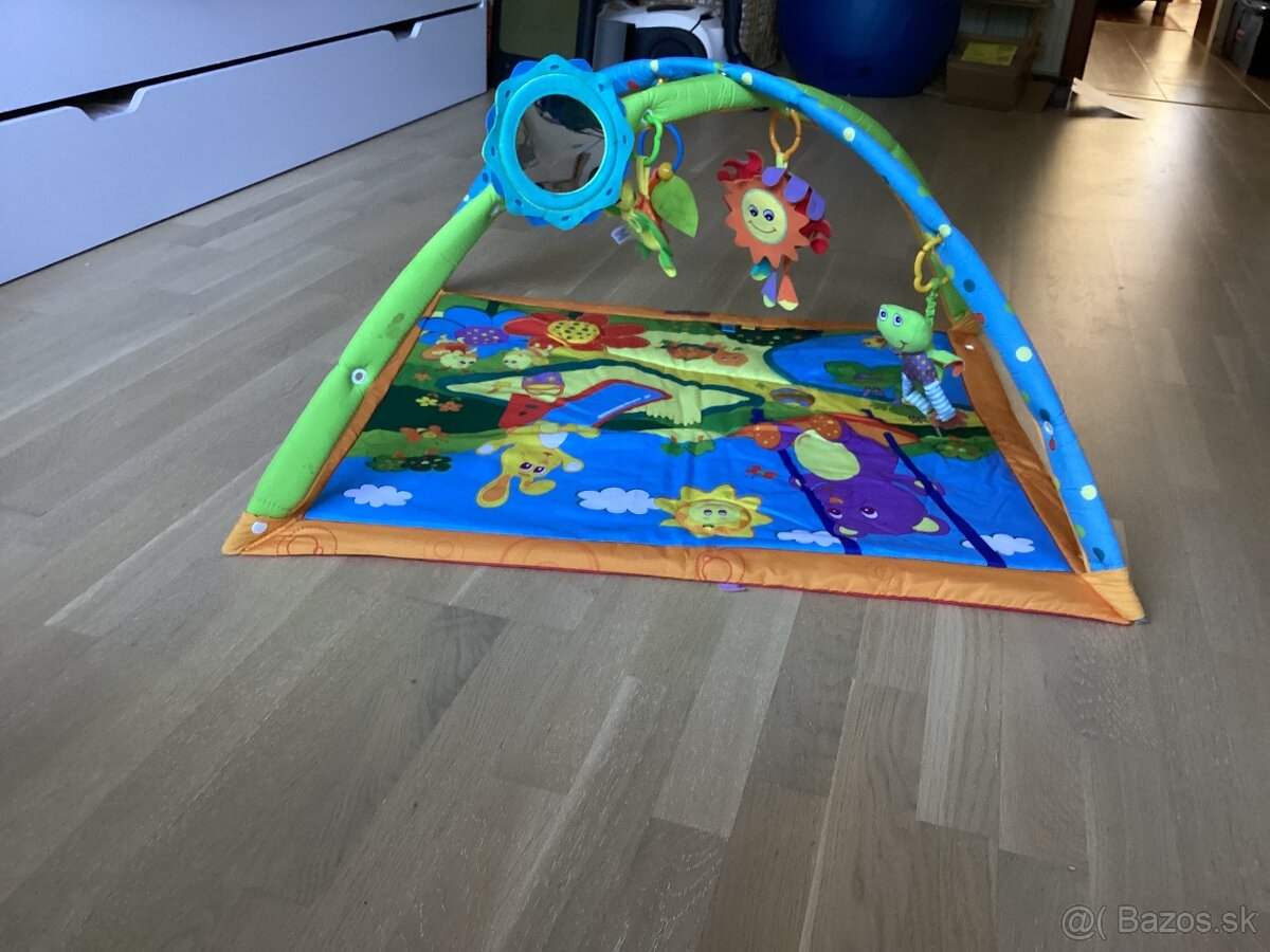 Predám hraciu deku pre bábätká, vhodná od prvých dní. Deka ma krásne pestré farby a niekoľko interaktívnych prvkov - slniečko s hudbou, naťahovaciu žabku, zrkadielko, korytnačku, listy. Rozmer deky 85x75 cm.