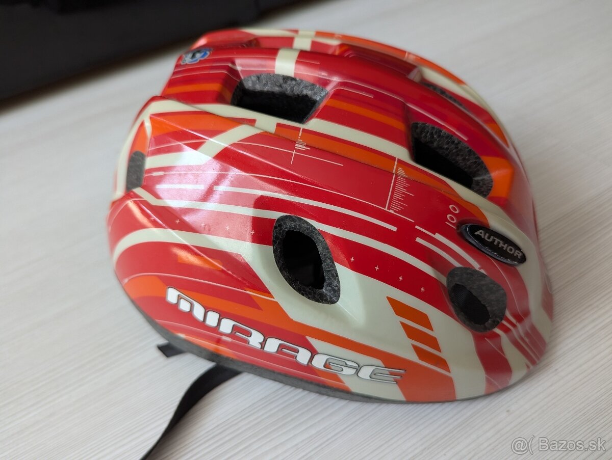 Detská cyklistická prilba AUTHOR MIRAGE veľkosť S 48 - 54cm v červenej farbe - vhodná pre dievčatá aj chlapcov. Prilba má 12 vetracích otvorov (3 predné chránené sieťkou), ZOOM systém - otočné koliesko pre nastavenie obvodu hlavy. Ľahká - len 223g.