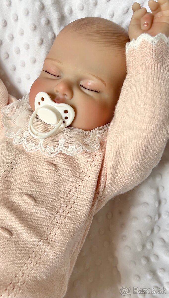 Dievčatko meria 60 cm, má látkové telo , ruky a nohy sú z vinylu, váži 2400 g. Je to veľké mimino, s maľovanými vláskami , dudlíkom na magnet a lepenými mihalničkami . Posielam oblecenú ako na fotke, pribalím jej flasku, nahradný dudlík a rodný list.