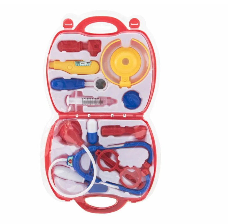 Všetko, čo je potrebné na ošetrenie pacientov, budú mať vaše deti už vždy poruke. Základný doktorský kufrík obsahuje 11 kusov lekárskeho náčinia, medzi ktorými nechýbajú stetoskop, teplomer, injekcia, kladivko a mnoho ďalšieho. Zdravotnícka plastová sada je uložená v plastovom kufríku s praktickým uchom na prenášanie. S týmto pomocníkom premeníte každú detskú izbu v lekársku ordináciu.