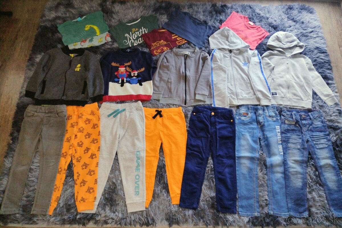 Balík vecí v top stave obsahuje: pyžamo 110/116, šedé rifle F&F 110, 2x tm. modré rifle 110,116, 2x mikina, jedna H&M 110/116, 4x mikina na zips z toho Adidas 110/116, šedá 116 Reserved, 3x tepláky 110, neboli nosené, 110 mensestrove nohavice, vian. svetrík 110, tričká s dlhým rukávom 116 Reserved, C&A 116, bordovej 110 a jedno tričko s krátkym rukávom. Spolu 18ks.