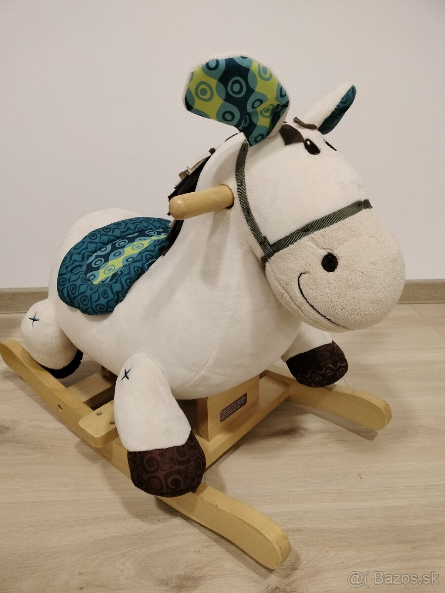 Je to plyšový hojdací kôň s dreveným podstavcom a rukoväťami.